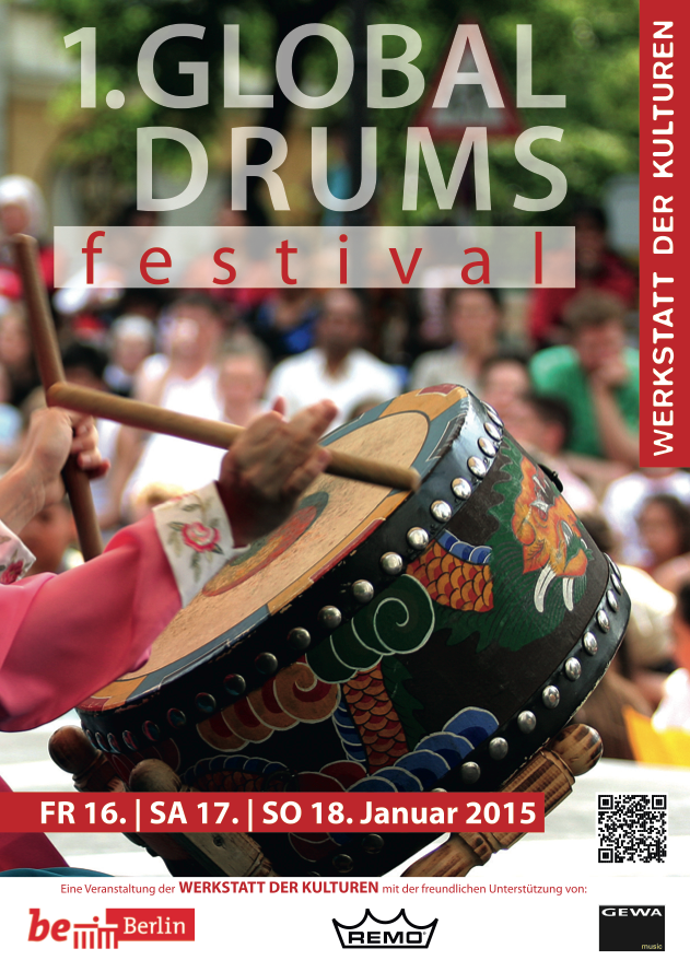 Vom 16. – 18. Januar 2015 zeigt die Berliner WERKSTATT DER KULTUREN beim 1. GLOBAL DRUMS FESTIVAL spannende Ausschnitte aus dem breiten Spektrum der transkulturellen Perkussion-Szene Berlins: Zwölf Festival-Konzerte, zwei Drum-Workshops und eine Live-Percussion-Party an drei Tagen unter einem Dach!