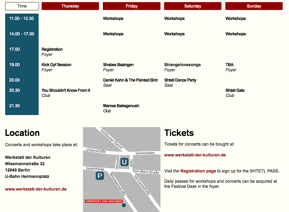 Tickets für Workshops und Konzerte sind als SHTETL PASS oder als Eintrittskarten zu einzelnen Veranstaltungen erhältlich. Je nach Veranstaltung im Vorverkauf oder an der Abendkasse. Bitte besucht die Seite von Shtetl Neukölln um Euch unter Registration für Workshops anzumelden.