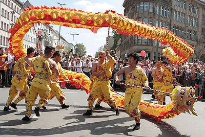 “Drachen- und Löwentänze sind vor allem auf dem Land in der Zeit chinesischer Feiertage allgegenwärtig. Während Musiker mit riesigen Trommeln und Gongs böse Geister verjagen und die Erde zum Beben bringen, erhebt sich auf einmal ein vergnügter Drache in die Berliner Lüfte, vollführt elegante Bewegungen und streift über die Köpfe der Zuschauer hinweg. “