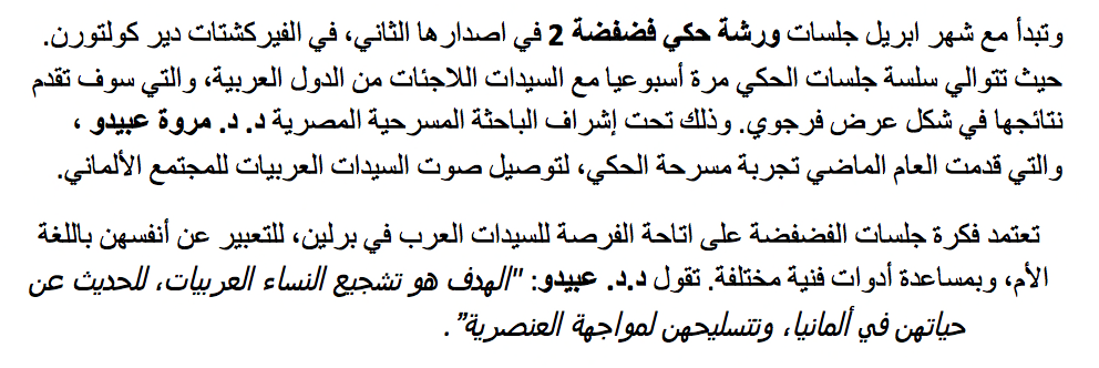 Im April startet die 2. Edition der FADFADAH Erzähl-Workshops für geflüchtete arabischsprachige Frauen, deren Ergebnisse in einer anschließenden Aufführung präsentiert werden. Leiterin des Projektes ist die ägyptische Theaterwissenschaftlerin Dr. Dr. Marwa Abidou, die im vergangenen Jahr mit der Erstauflage von Fadfadah das Format Erzähltheater nutzte um die Fluchtgeschichten syrischer Frauen hörbar zu machen. „Der Fadfadah-Workshop ist eine Art Gesprächskreis, in dem sich arabischsprachige Frauen im geschützten Raum äußern und mit Hilfe von künstlerischen sowie darstellerischen Mittel ausdrücken können,“ so Projektleiterin Abidou, „dadurch werden sie ermutigt, über ihr Leben in Deutschland zu sprechen und sich gegen rassistische Äußerungen zu wehren".