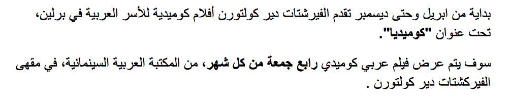 +++ Eintritt frei +++Von April bis Dezember 2017 findet daher an jedem 4. Freitag im Monat, ab 18h, die Familien-Veranstaltung COMEDIA statt, an der Filmkomödien der 50er bis 80er Jahre aus der arabischen Bibliothek gezeigt werden.