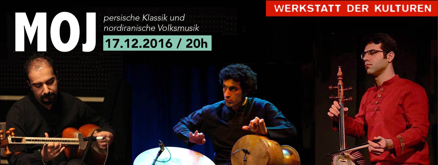 Moj ist die Welle, die Veränderung, die fließt, in Ebbe und Flut, stetig wachsend und fallend. So wie das Leben am Kaspischen Meer von Lebensfreude und Gelassenheit, aber auch von Tiefe und Schwere erfüllt ist, so spiegelt sich in der Musik des Trios Moj der traditionelle persische Klang des Nordens, der Berge und der Küste wider. Mit den Saiteninstrumenten Setar, Tar und Oud, dem Streichinstrument Kamancheh und den Perkussions-Instrumenten Tonbak und Daf fügt sich ein Ensemble zusammen, dass gekonnt klassische persische Sounds weiterarrangiert zu einer allgegenwärtigen Sprache des Exils.